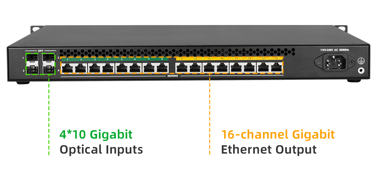 Support 4*10 Gigabit Optical Inputs,16-channel Gigabit Ethernet Output