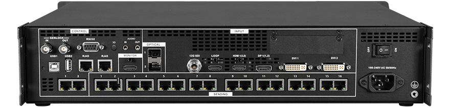 2×HDMI2.0, 2×DP1.2, 2×DVI, 1×audio,1×12G SDI;and its outputs support 16 Gigabit network port(s 8 main 8 backup), 2×10G optical fiberinputs/outputs (for signal input or copy the output with ethernet), 1×HDMI Loop, 1×audio output and 1×HDMI monitor.