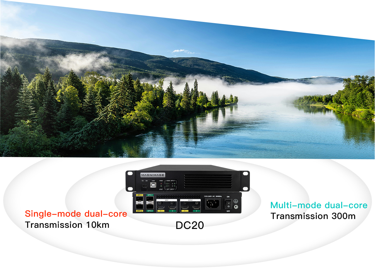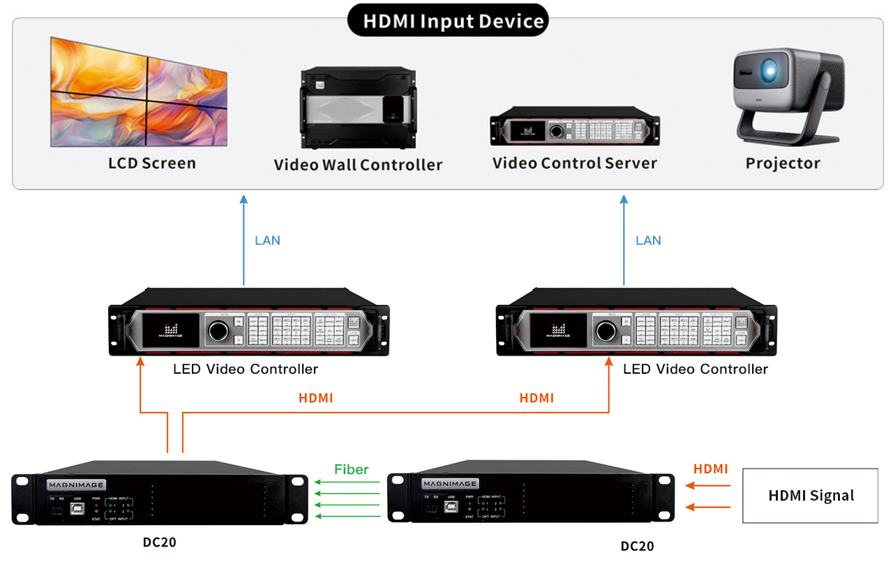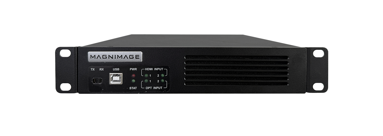 When using the optical input of Magnimage’s video control server (such as LED-FW10-C,LED-FW16-C, etc.) at the back end, it can be used with a front-end HDMI output device to convert the HDMI input to OPT output for long-distance fiber optic transmission.