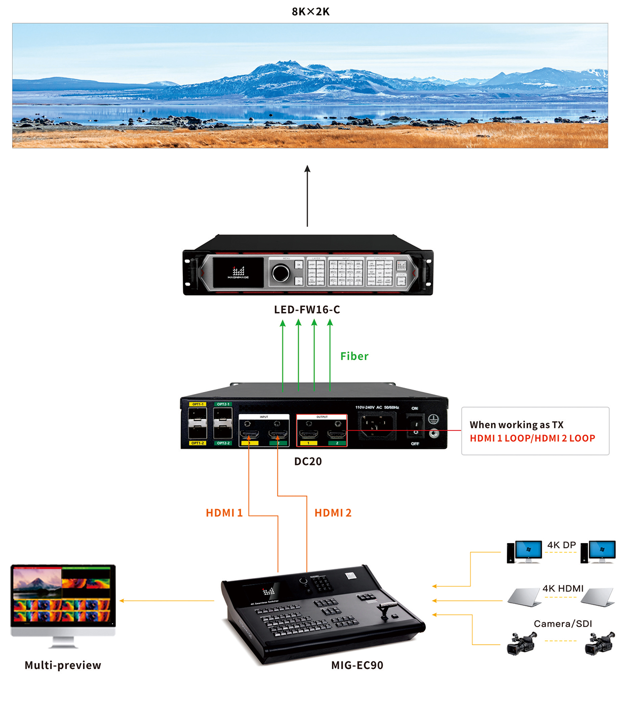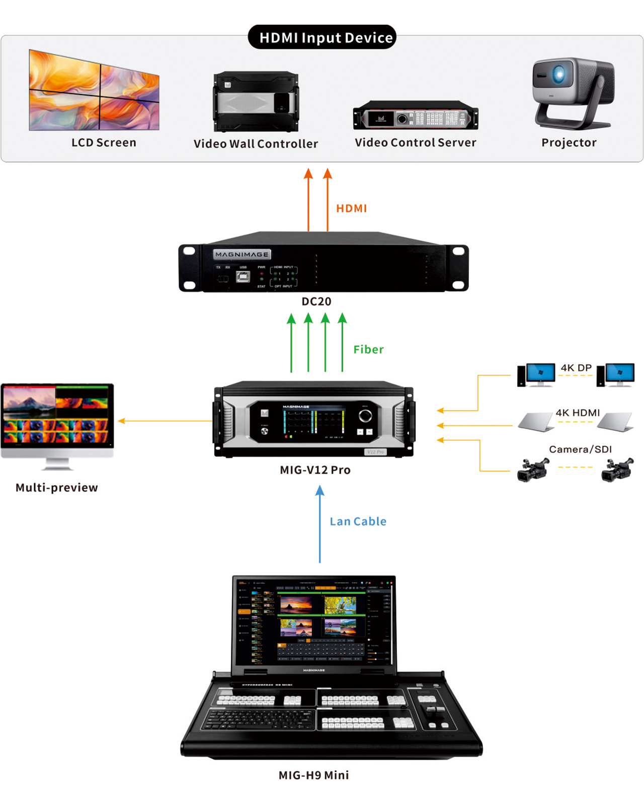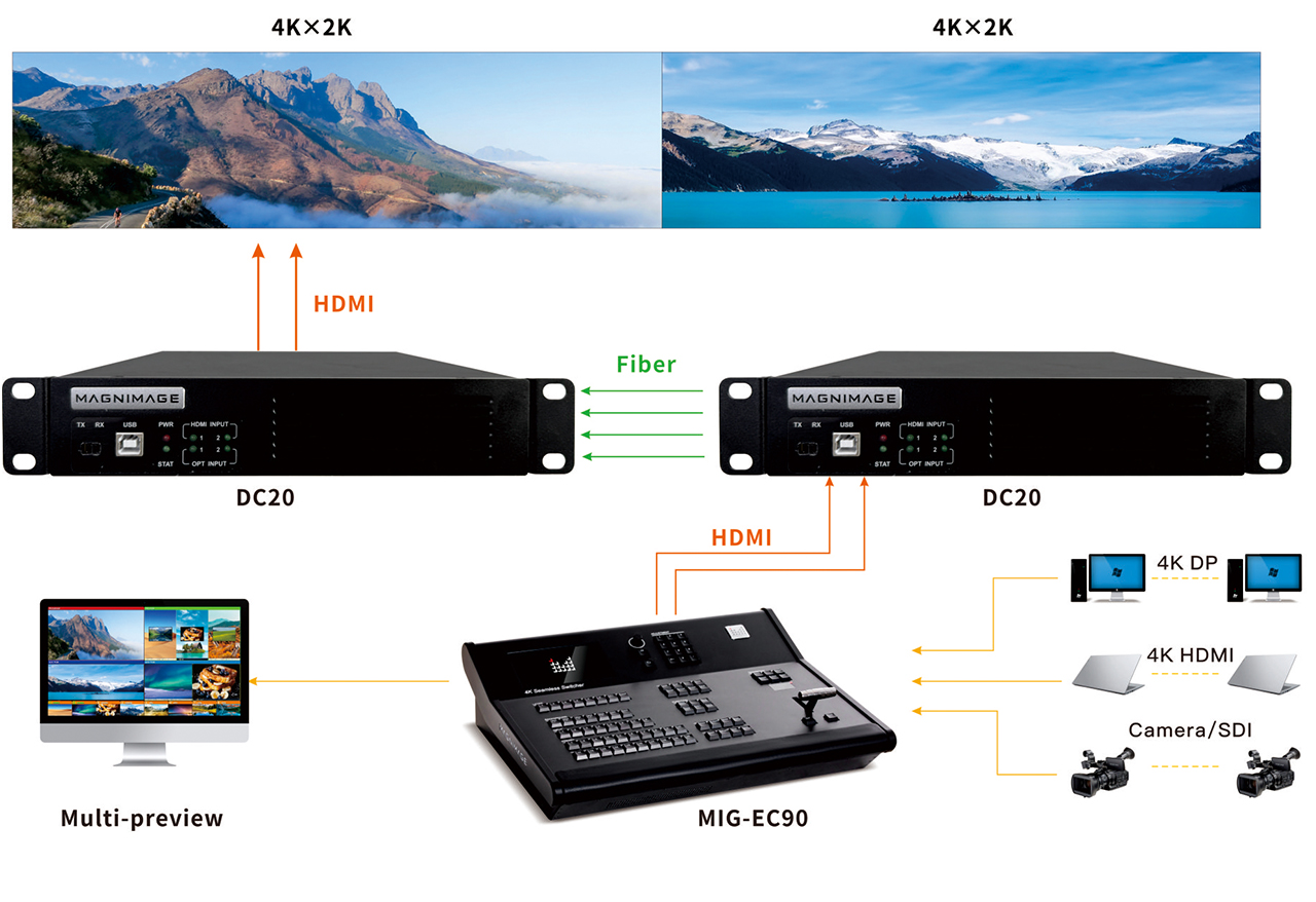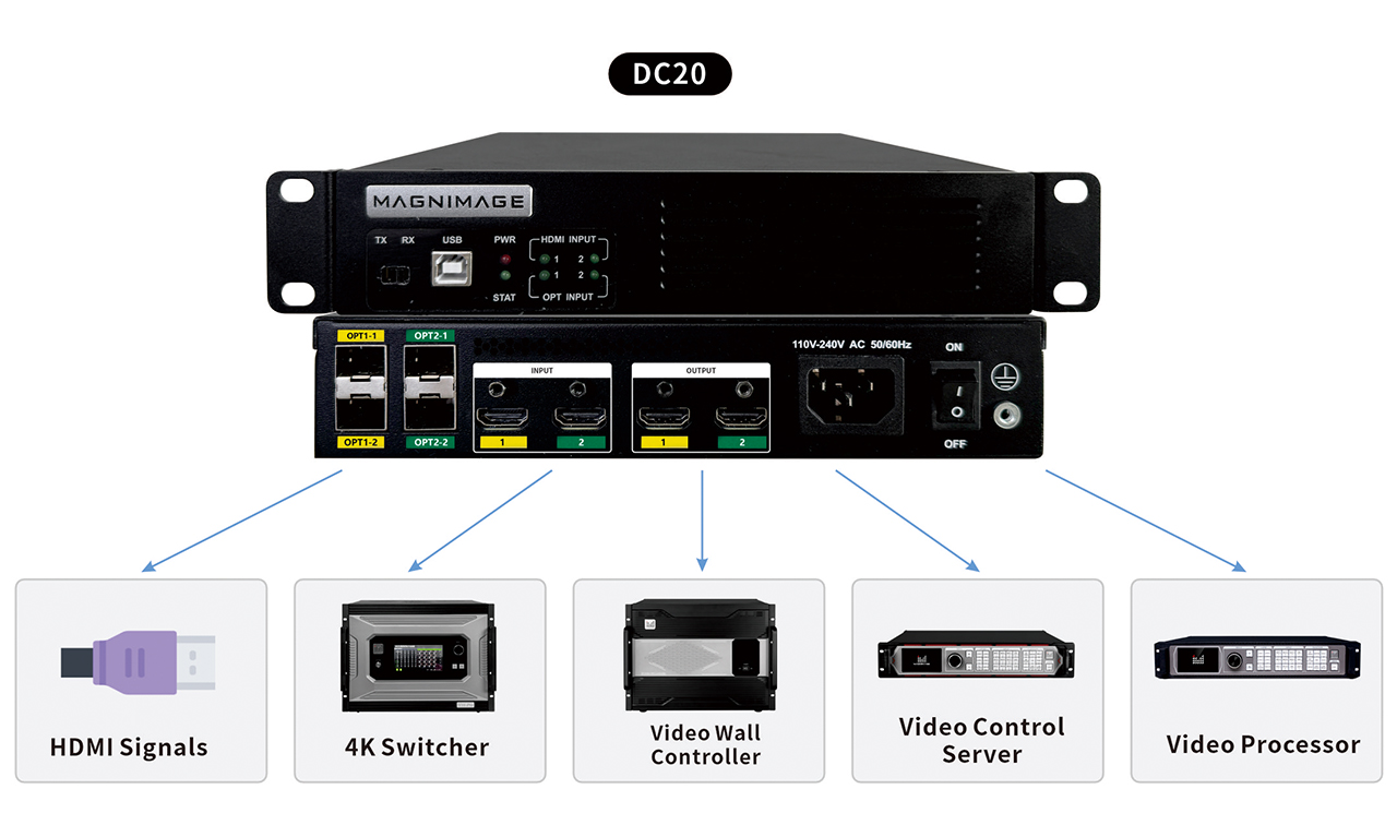 Compatible with Magnimage's video wall controller, switchers, video control servers, video processors, and other HDMI input devices such as LCD screens and projectors.
